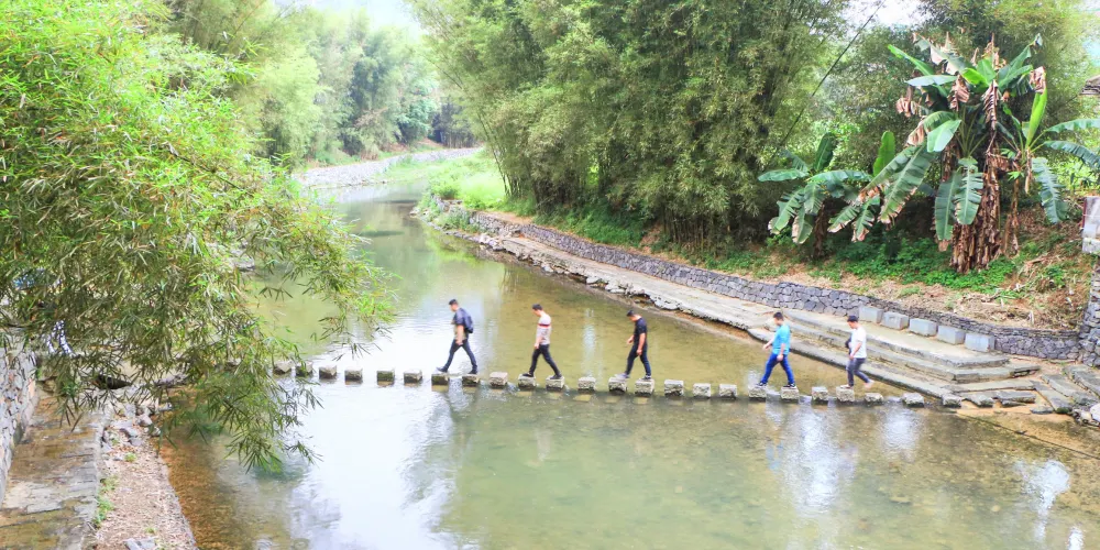石跳橋是黃姚古鎮景點之一,整座橋長19m,由31個石墩組成,石墩由兩塊高矮不同長寬相同(約35㎝)的正方形面青石條組成。高石墩露出水面,較矮的石墩埋於下方,起支撐作用,而31個石墩間距按人行走步伐恰當排列,既利人行,又不影響泄洪。而且由埋在河床下的松木固定在一條直線上,上小下大,既小巧,又牢固。