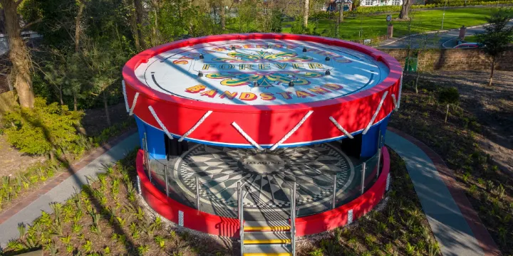 草莓園位於利物浦市郊,離約翰·列儂故居不遠,十九世紀時曾是種植草莓的農場,後來救世軍(SalvationArmy)買下這塊地,蓋了一座孤兒院。這個草莓園之所以為人所知,很大程度上是因為約翰·列儂那首《StrawberryFieldsForever》。列儂小時候經常和小夥伴到草莓園玩兒,而且較期待的就是每逢節假日草莓園舉辦的小童派對,樂隊的演奏讓他興奮。現在我們能看到的衹剩紅色的鑄鐵大門,通往庭院的路上草木叢生,顯示着它現在的荒蕪,但這依舊掩蓋不了全世界披頭士粉絲的狂熱,即便現在的大門已經不是當初那個,而是新換的,上面仍舊佈滿了歌迷的塗鴉,表達他們對約翰·列儂的懷念。這裡是披頭士MagicTour的一個必經之地,但參加MagicTour衹能聽聽講解、拍照留念,時間很短,如果是狂熱的披頭士迷建議自行前往。