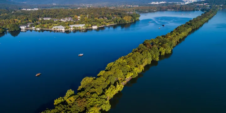 蘇堤貫穿西湖南北,是蘇東坡在杭州做官時所建,也叫“蘇公堤”。因春景迷人,亦被稱為“蘇堤春曉”。蘇堤全長近3公里,堤上柏油路兩側柳樹成蔭。你可以漫步欣賞三潭印月、雷峰塔等西湖美景,人少時騎單車也很不錯。春季的蘇堤景色迷人,適合散步、攝影;而夏季則可觀賞到蘇堤西側大片的荷花。走在蘇堤兩側的臨湖小徑上欣賞湖色十分愜意,走累了還可在長椅上小憩。