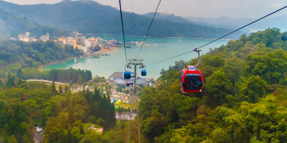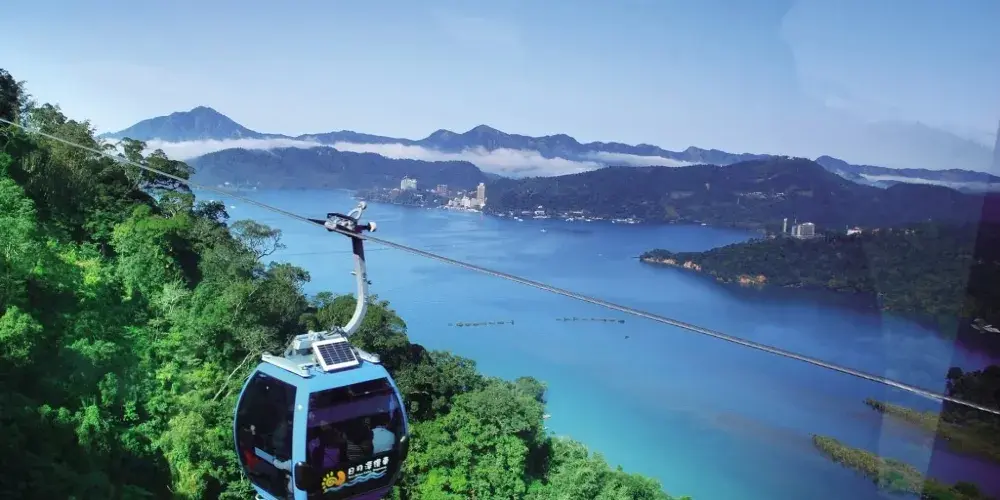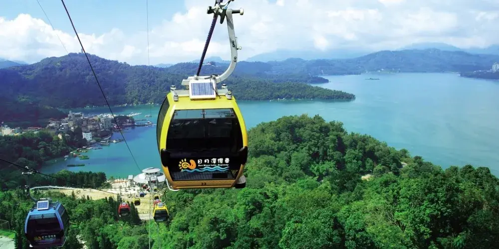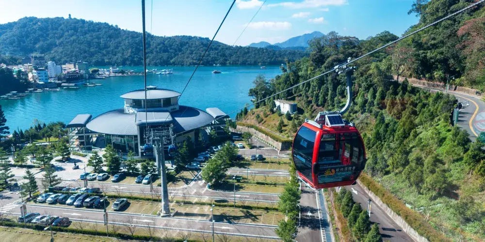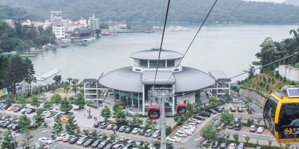 【日月潭纜車】台灣第一座輕載量空中纜車系統,距地面40公尺,車廂明亮寬敞,微風徐徐,除帶您鳥瞰景區美景,還可連接前往日月潭纜車,全長1.877公里,讓您7分鐘盡覽日月潭湖光山色及九族山林之美。