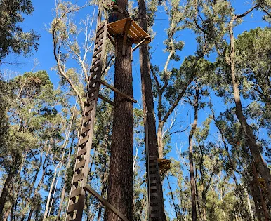 Forest Adventures South West坐落於西澳著名的盧德洛圖雅特森林(Ludlow Tuart Forest)中,距巴瑟爾頓僅約15分鐘車程,佔地8英畝原始灌叢,是澳洲西南部最早引入歐洲高空繩索安全標準的大型樹上探險基地。園區共6條樹冠課程,高度從3米到19米遞進,集合繩橋、搖擺木樁、泰山跳、滑板滑索等70餘項挑戰,其中最長飛索達150米,全部滑索總長超過500米,可讓7歲以上、110厘米至120公斤以內的參與者在2.5小時內盡情穿梭樹梢。每場次始於專業教練的穿裝備講解與低層練習道,確保掌握「一掛一解」安全鎖操作後才可上樹。現場設有儲物櫃、野餐草坪與簡餐小賣部,無論是親子同樂、同學拓展還是公司團建,只要穿上運動鞋、帶好勇氣,就能在這片世界罕見的圖雅特森林頂端體驗「蜘蛛俠」視角,完成自我挑戰並收穫綠意盎然的回憶。