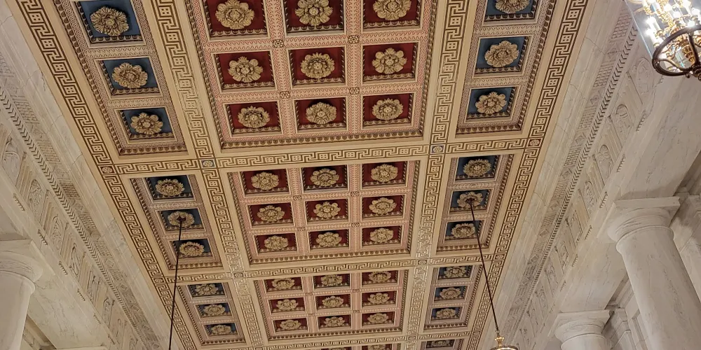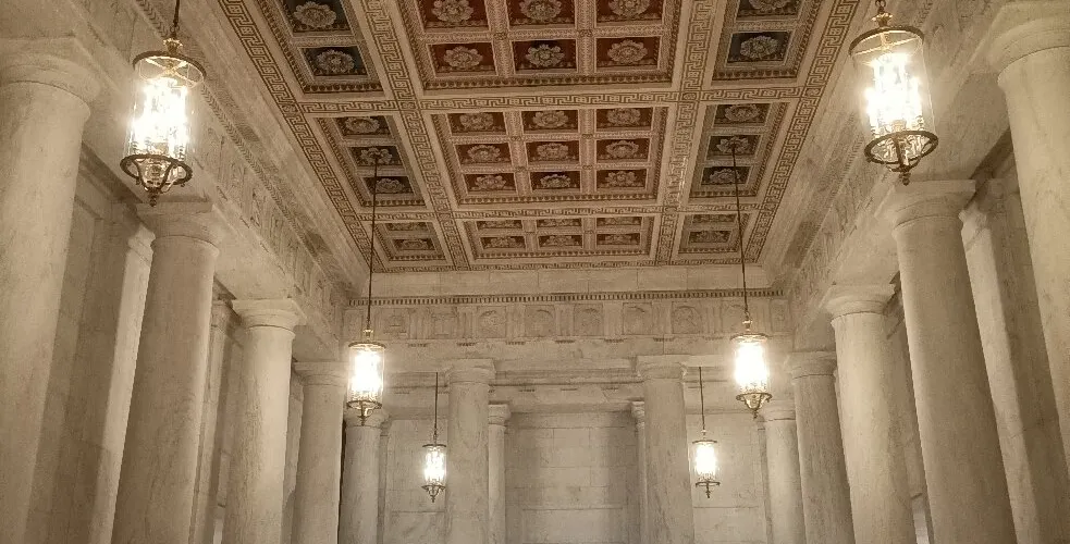 美國聯邦法院是美國很高的審判機構,位於國會大廈的東面遙相呼應。法院是一幢以大理石為主材料建造而成的古希臘神廟式建築,在其整體建築和雕刻細節的設計上,處處體現了美國司法的精髓。1.題字浮雕整個法院的門廳由十六根大理石柱撐起,主入口處有着正義之思與法律之威兩尊塑像。拾階而上,三角形的門楣上,刻着法院一直奉行的警世之句——“司法公正”的字樣。2.大會堂主廊走上石階,兩扇沉重的銅門展現在眼前,分別嵌有四幅雕刻圖案,記載着西方法律演變史中的重大事件。推開銅門,便進入名為大會堂的主廊,走廊兩側是大理石雕成的雙排柱。牆上懸掛着歷任法官的半身像,並飾以立法者與紋章圖案的圓雕。