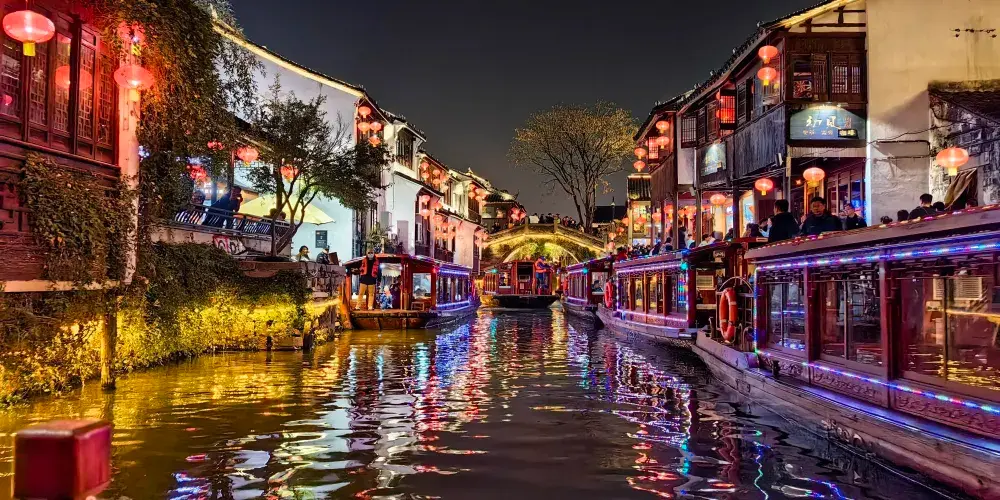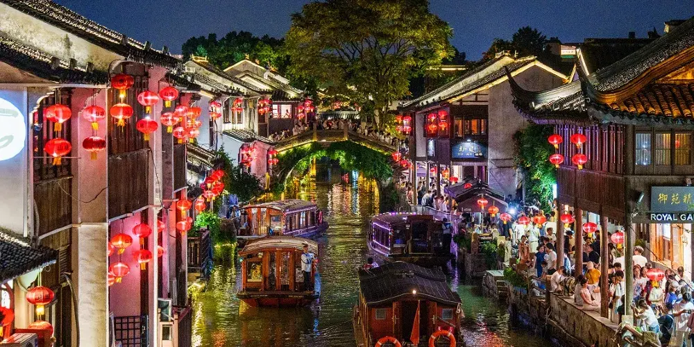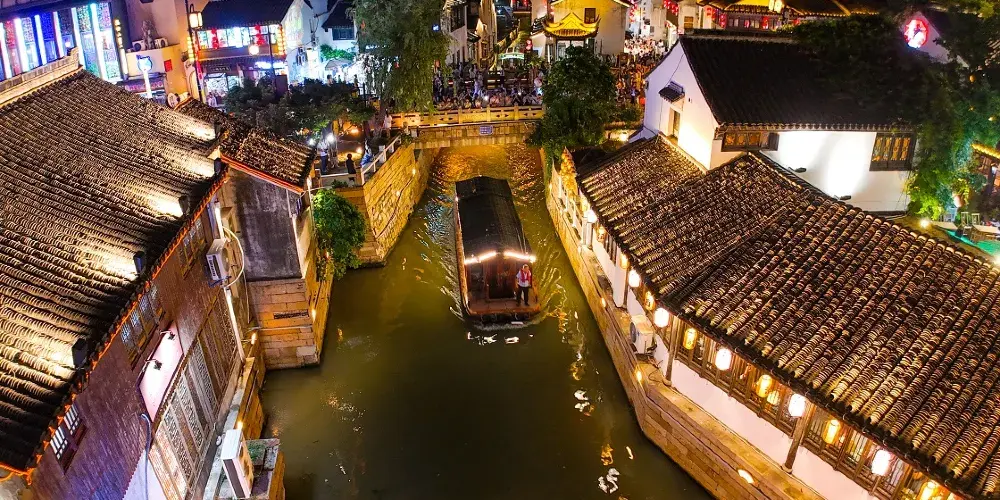華燈初上,古運河畔的景色便更加迷人。遊人們猶如置身燈影中的水天堂,充分感受到蘇州這一東方水城的獨特魅力。一艘艘穿梭往來的遊船,木船劃破平靜的河面,激起陣陣漣漪,水上夜景委實迷人,身臨靜謐優雅的山塘街環境,目睹妙不可言的江南水城夜景,怎不使人心曠神怡,如痴如醉,流連忘返。