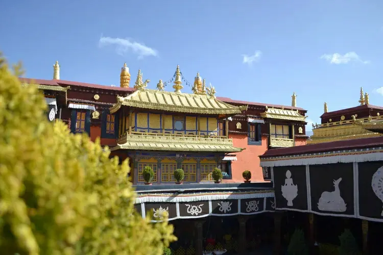 此外,寺內有長近千米的藏式壁畫《文成公主進藏圖》和《大昭寺修建圖》,還有兩幅明代刺綉的護法神唐卡,為難得的藝術珍品。轉經道拉薩有“內、中、外”三條轉經道,都是圍繞着大昭寺為中心而進行。其中,沿寺內千佛殿繞覺康大殿一圈為內轉,稱“囊廓”;沿大昭寺外圍一圈為中轉,稱“八廓”;圍繞布達拉宮、葯王山、小昭寺和大昭寺一圈為外傳,稱“林廓”。景點導覽沿正門進入大昭寺後是一個天井式院落,院子東側有數排酥油燈,因信徒每天都會添加酥油,故常年不滅。酥油燈後面既是大昭寺主殿正門,門口左側為紅教創始人蓮花生大師,右側為強巴佛,即彌勒佛,也稱:未來佛。右側牆上是關於大昭寺建寺故事的壁畫,主要內容是7世紀時期布達拉宮的樣子,以及當年填湖建大昭寺的情景。按照順時針的順序過去是供奉黃教祖師宗喀巴大師及其八大弟子的佛殿。繼續右繞前行,穿過兩邊的夜叉殿和龍王殿,數百盞酥油供燈後面便是著名的"覺康"殿。它既是大昭寺的主體,也是大昭寺的精髓之所在。覺康殿中央為大經堂,是平日裏喇嘛們唸經修行的地方,四周有很多小經堂,其中不可錯過的既是位於正中的釋迦牟尼佛堂,供奉着文成公主帶來的釋迦牟尼十二歲等身金像,這裡是大昭寺的中心,也是前往此地的虔誠朝拜者嚮往的聖地。庭院旁有樓梯通往二樓和三樓,二樓有供奉藏王松贊幹布、文成公主、尺尊公主的法王殿和供奉吉祥天母的班丹拉姆護法神殿。站在二樓寬闊的露台上,可遠眺布達拉宮,是拍照的絕好位置。三樓的金頂也是大昭寺的看點之一,衹不過三樓絕大多數時候不對外開放,萬一機緣巧合可以登上三樓,四座金碧輝煌的金頂讓人歎為觀止。