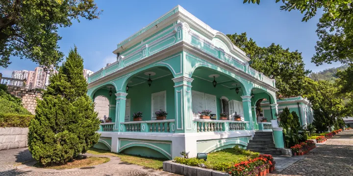 龍環葡韻住宅式博物館為澳門八景之一,曾是離島高級官員的官邸,亦是一些土生葡人家庭住宅。政府將這一建築群進行徹底修復,並作為展示的葡國建築特色的博物館。從威尼斯人度假村步行到龍環葡韻,沿著坡道一路下行,五座薄荷綠色的葡萄牙風格建築很顯眼,這便是龍環葡韻住宅式博物館。