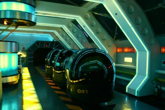 宇宙探險車 ,來賓將搭乘由十三節列車所組成的探險隊,由太空站出發,先前往太陽,利用重力加速從內太陽系向外航行。探險隊原本計劃中的旅程是逐一遊覽各大行星,但在木星附近卻發生了意外。探險隊進入了外星人的世界,並藉著他們的科技遊歷星系、經歷超新星爆炸與黑洞強大的吸力,突破光速暢遊時空,最後終於安全回到太空站上。這一段旅程將帶給遊客無限的期待與意外的驚喜!