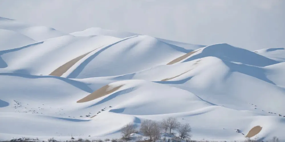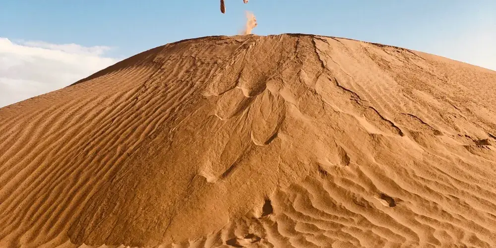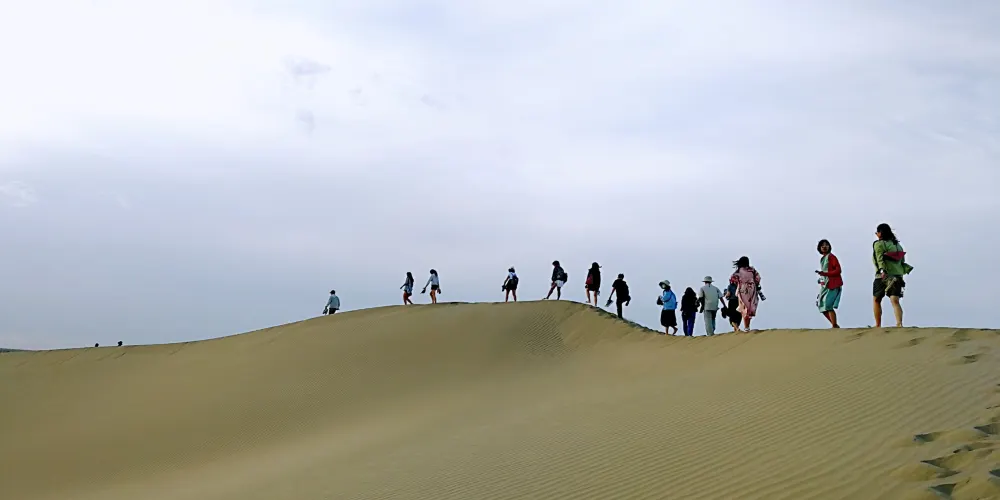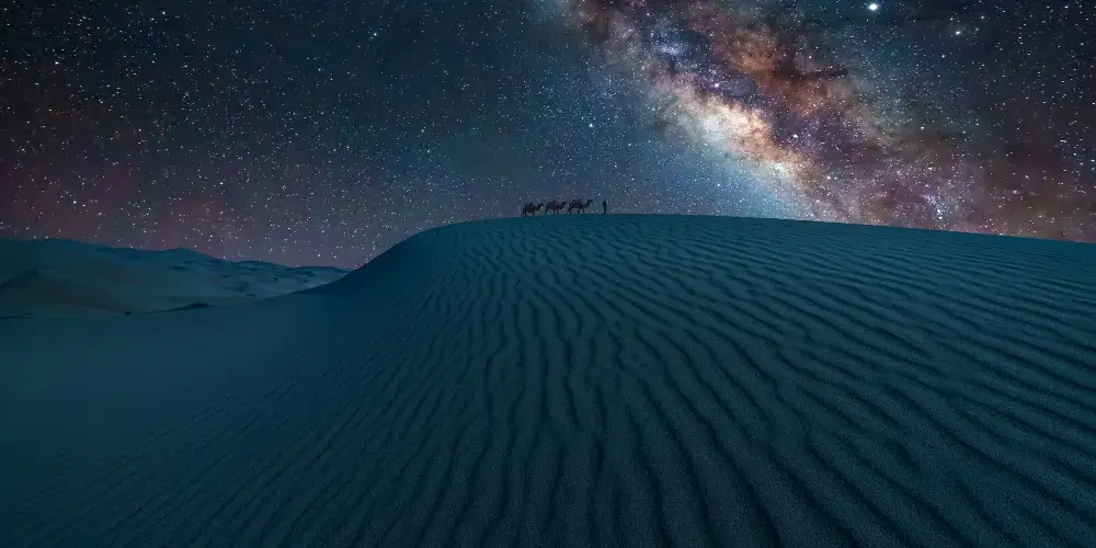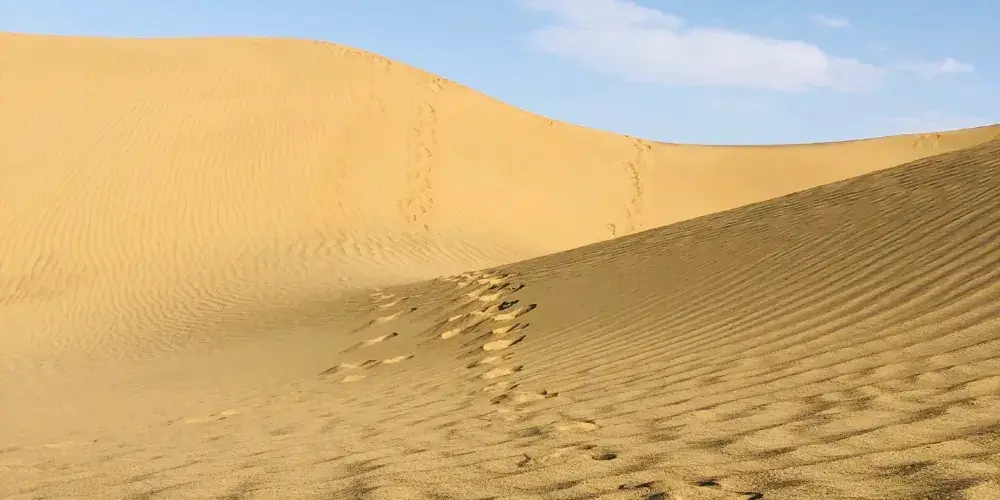 塔克拉瑪干沙漠位於南疆塔里木盆地中心,人們通常稱它為“死亡之海”,是世界十大沙漠之一。沙漠裡有兩座紅白的高大沙丘,名為“聖墓山”,分別由紅沙岩和白石膏組成。白天的沙漠艷陽高照,沙面溫度有時候高達70-80℃,高溫使得地面的物體飄忽不定,人們會常常看到遠方出現綠洲,這就是塔克拉瑪干沙漠中的“海市蜃樓”。