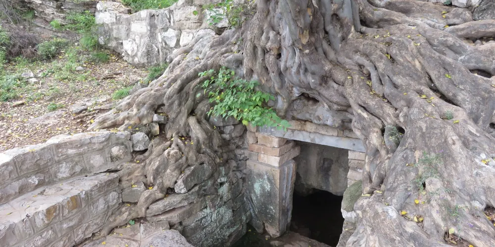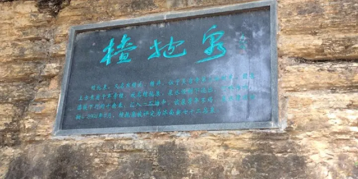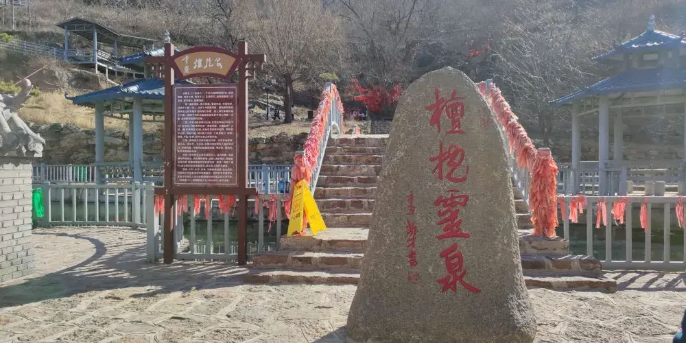 檀抱泉位於濟南長清區萬德鎮靈巖峪中的第四峪村,因山泉被一棵古青檀遮映,樹根擁抱而得名。檀抱泉從山崖的石縫中自然流出,流進一人工用青石砌壘的水池中。當遊人來到此處,會看到一股清泉源源不斷地從山澗往外流淌着。水流進水池中,發出咚咚的響聲,水池中的泉水清可見底。泉池南坡的山崖上,生長着一棵古青檀樹,樹根蜘蛛網似地暴露在山崖上,檀樹遮映着泉池。站在泉邊觀賞檀抱泉的景象,會讓人如痴如醉,心曠神怡。