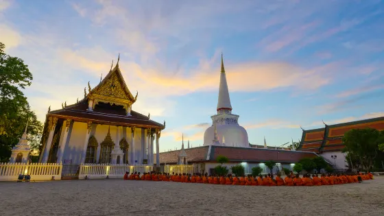 這是一個歷史悠久的佛教寺廟群,主塔是一座白色金頂塔樓,週邊有小佛塔。寺內有精美的雕塑和壁畫,寺廟外面還有一個博物館。