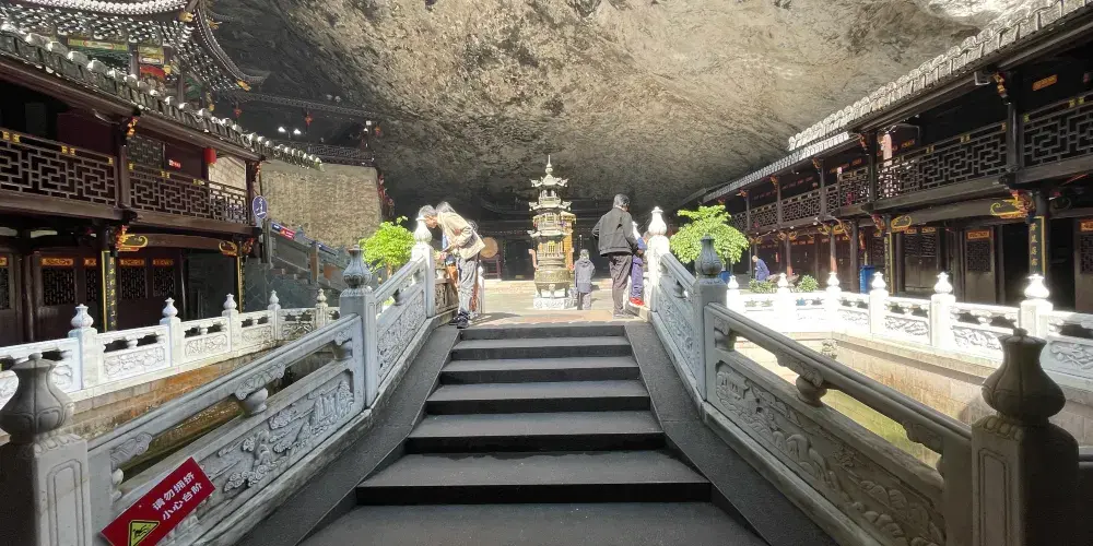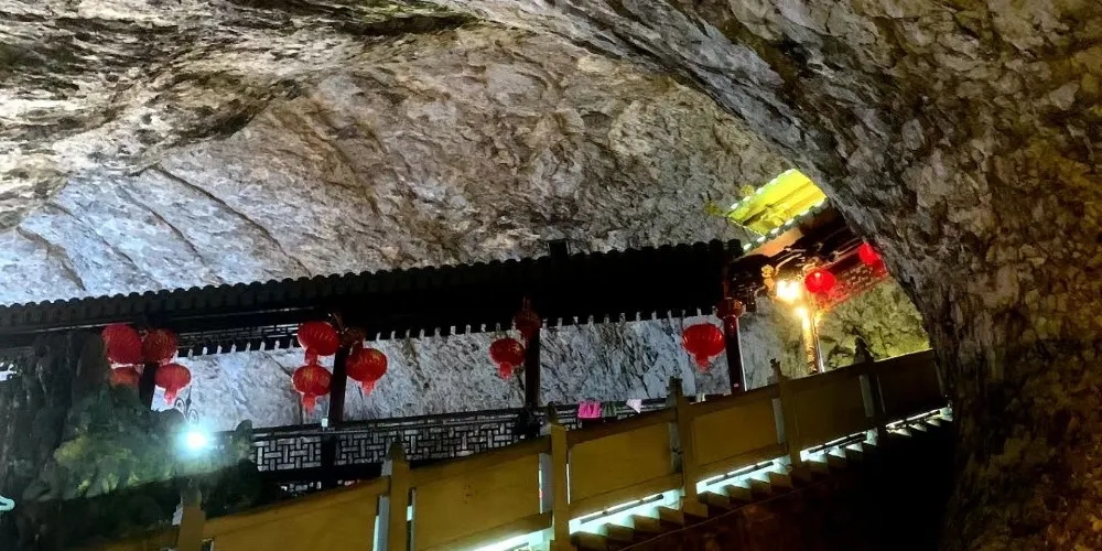 崖下庫位於巖頭鎮西南,臨近埭頭古村,是大若岩景區的一部分。遊覽崖下庫大約需要2小時,可見景區並不算大,站在山下便能看到對面崖壁上的懸空棧道。大部分遊客進入景區後會選擇右邊,要避開人流不妨由左邊遊步道上山,反方向遊玩。