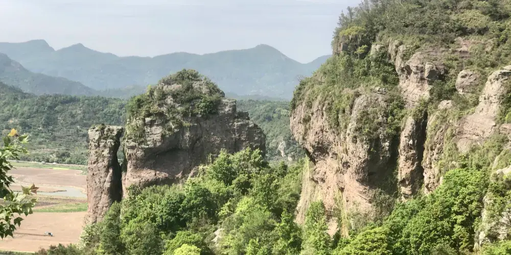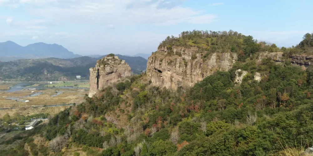 石柱靈峯位於桃渚鎮2公里處,石柱峯高141.81米,上平下削,玉質嶙峋,氣勢雄偉,後有一小石柱,低崗相連,醋似駱駝靜卧。峯下有桃江十三渚,彎彎曲曲,水抱洲渚,狀如“九龍戲珠”。田園風光,如詩如畫。附近有將軍巖、玉壺巖、二蛙登山、龍斬腰等景及明霞、漏月諸洞。西連秀麗芙蓉山,雄壯白巖山,羣峯怪巖,羣洞密林,別有大地。