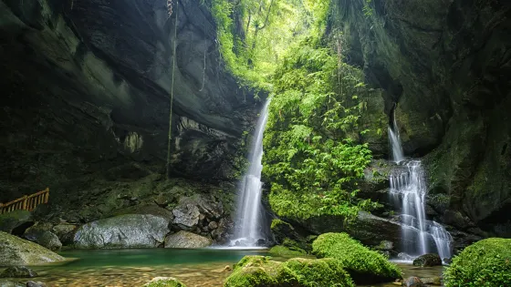 是新竹縣關西鎮錦山裡帽盒山下的一個石灰岩洞,洞內幽深莫測,少有人煙,每當夕陽西下,蝙蝠千百成群,滿天飛舞,上下交織穿梭,與嵐光夕陽掩映,堪稱奇觀,因而有新竹十二勝景之一“帽盒翔蝙”之譽。進入蝙蝠洞內,建議穿著長袖長褲,洞口狹小,僅容一人側身進入,蝙蝠就蟄伏在石洞的頂部,洞內崎嶇狹窄,忽上忽下,又有水滴不時由洞頂滴下,出得洞來,難保不灰頭土臉。