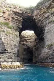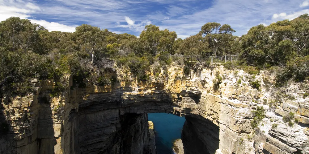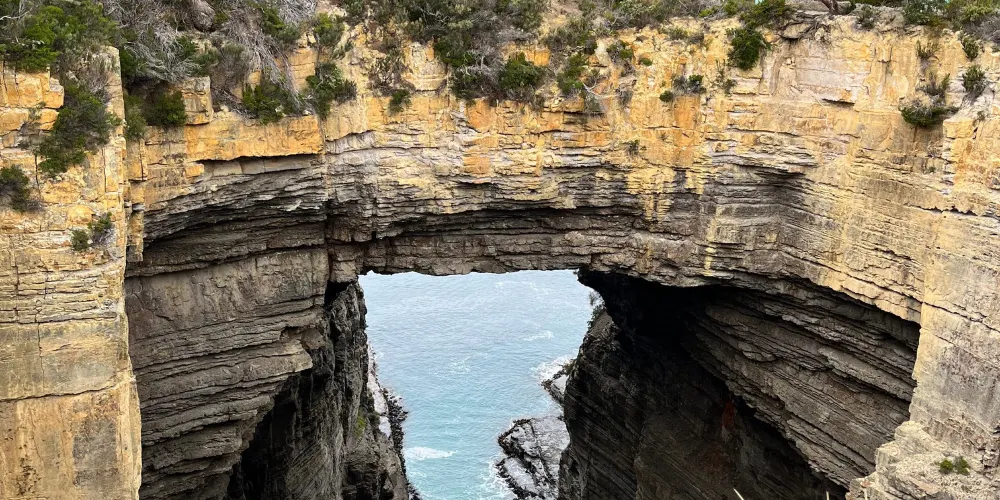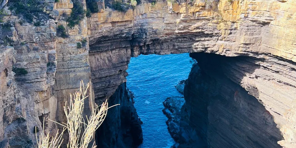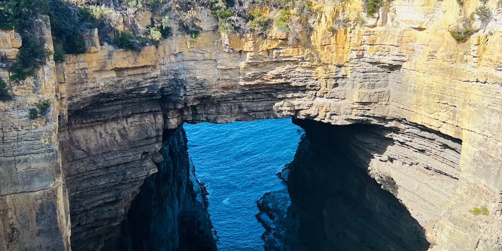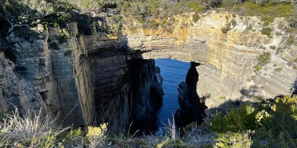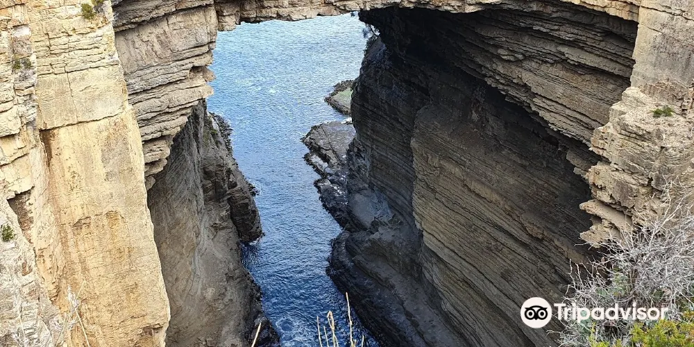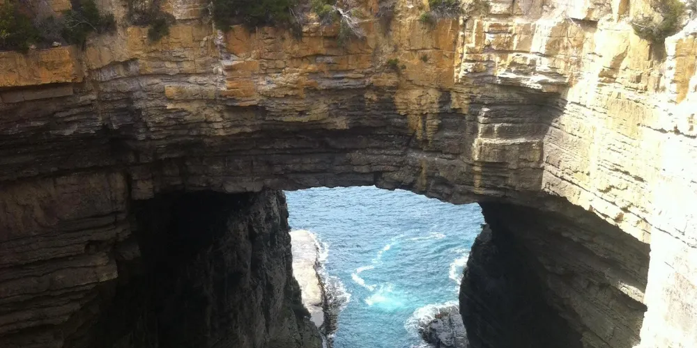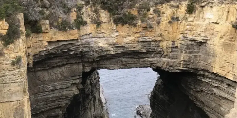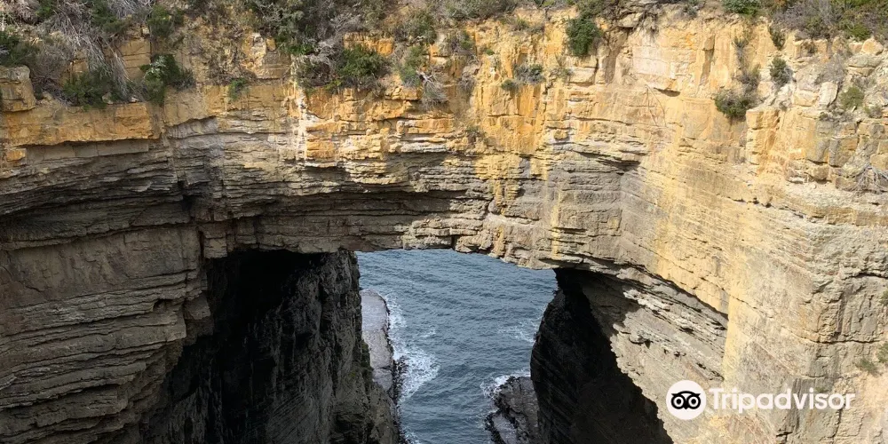 塔斯曼拱門位於澳洲塔斯馬尼亞州的塔斯曼半島,是塔斯曼國家公園內的知名自然景觀。它是由海水長期沖蝕形成的天然石洞,也被稱為海蝕洞或海蝕拱門。在數百萬年的時間裡,潮水不斷侵蝕海岸岩石,使其逐漸凹陷,其後被風浪挖穿,形成瞭如今這座氣勢雄偉的石造拱門。拱門頂端離海面有 52.7 公尺高,從這裡俯瞰,巨大的橋洞內灌木茂盛,洞壁上呈現出層疊岩的特徵,這是海底地殼隆起的有力證明。