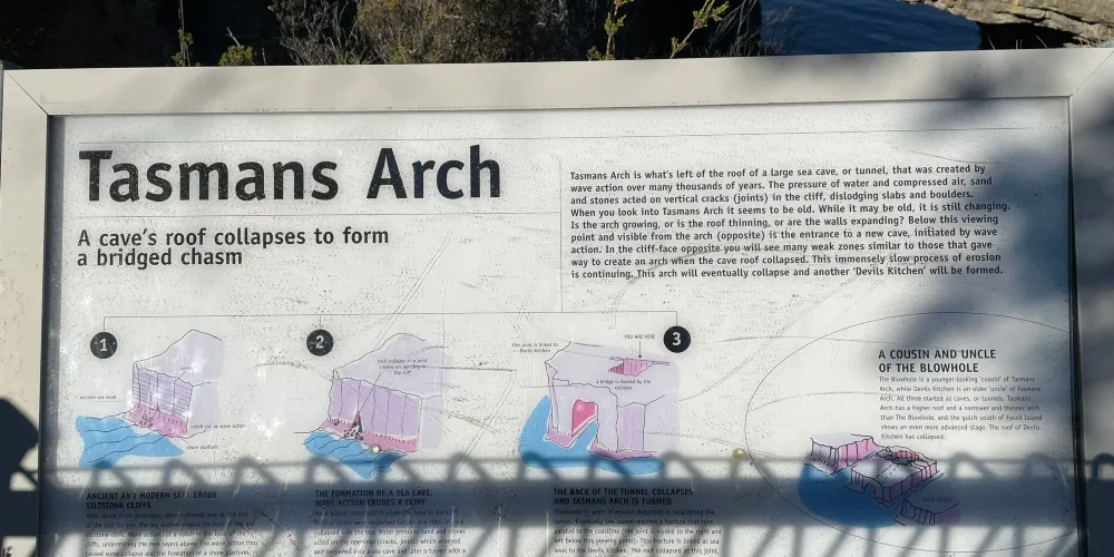 塔斯曼拱門以荷蘭探險家阿貝爾・塔斯曼的名字命名,他是第一個發現塔斯馬尼亞的歐洲人。如今,這裡吸引著許多遊客前來觀賞。遊客可以沿著步道走到觀景台,欣賞令人眩暈的洞穴和壯麗的海岸線景色。