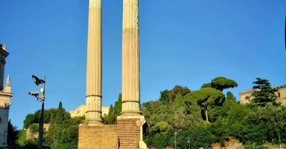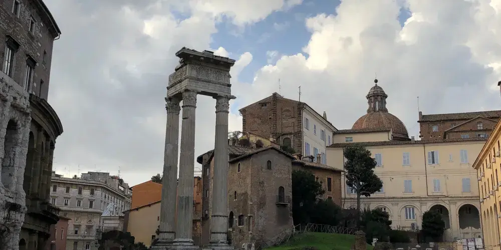 參觀完古羅馬廣場東側建築,可沿著神聖之路折返,欣賞廣場西側的風光。在西側能夠欣賞朱利亞會堂(朱里亞巴西利卡)留下的地基部分——雙子神廟(Tempio di Castor e Pollux)的遺跡。在朱利亞會堂的右側有一個缺口,它通往古羅馬的大下水道,道路的盡頭是用籬笆圍起來的古聖母堂(Santa Maria Antigua),裡面有非常精美的壁畫,可追溯到七、八世紀。