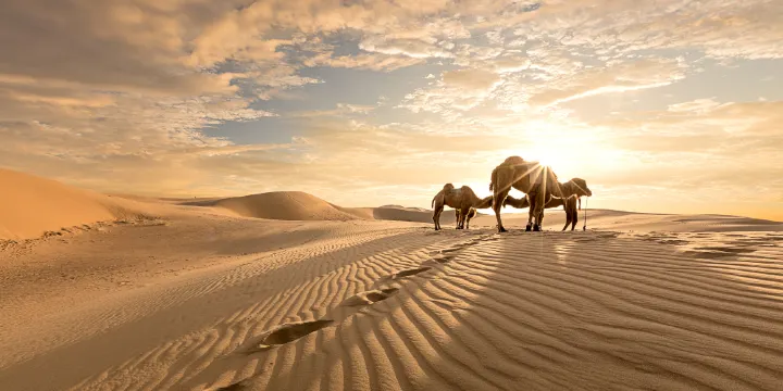 騰格裏沙漠位於內蒙古自治區阿拉善左旗西南部和甘肅省中部邊境,是電影《刺陵》的取景地,也是年輕人嚮往的小眾旅行地。在這裏可以體驗騰格裏沙漠星空露營,也可以騎着駱駝遨遊在沙海,或乘坐越野車在沙漠裏馳騁感受激情。騰格裏沙漠沙峯壯闊宏大,沙粒細微軟滑,顏色金黃閃亮。行至大漠深處,除了金色的沙海,還有許多湖泊,遠遠望去,湖邊堆堆鹽囱恰似冰雪,湖面泛着銀光,猶如沙海冰川。