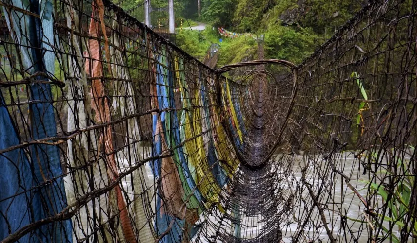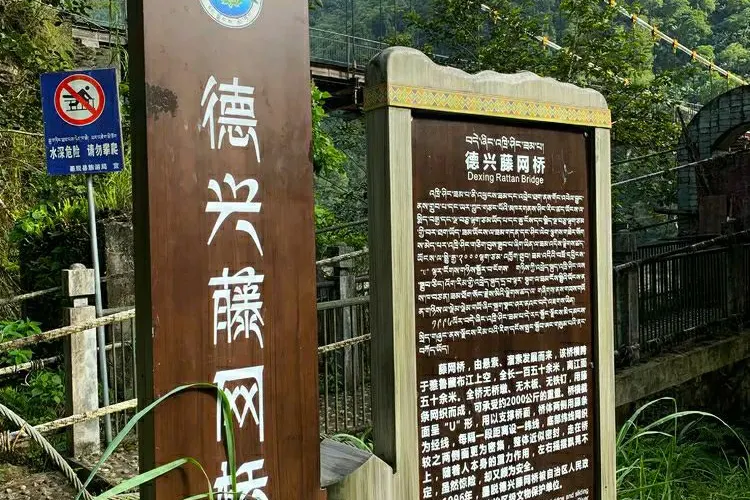 從縣城出發,沿着雅魯藏布江邊的公路前行大約4-5公里,就能看到一座通往江對岸的公路大橋,公路大橋邊就是古老的藤橋,現在已經不再使用,雖有鋼索加固,由於年代較久,不允許遊客通行。這座藤橋曾經是墨脱人出行的必經之路,也是它聯通了雅江的天塹,成為墨脱人和外界聯通的紐帶。