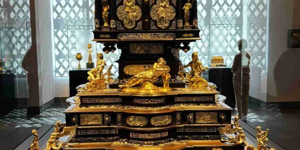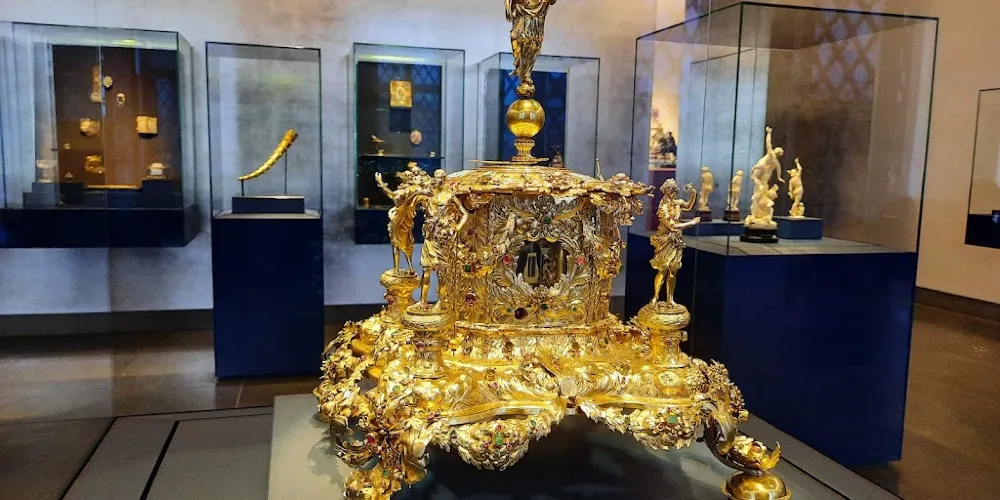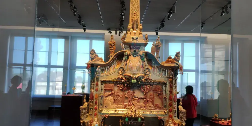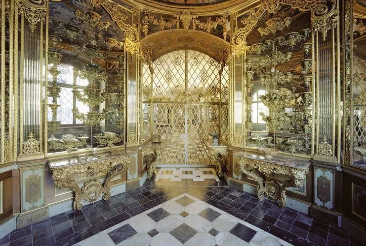 綠穹珍寶館可謂是德累斯頓王宮的鎮殿之寶,這個歐洲最大的珍寶館內展出了上千件珍貴收藏品為保護文物,舊珍寶館對每天的參觀人數有所限,所以想要一睹這些傳奇的歐洲珍寶的話最好提前預訂門票。舊珍寶館位於一層,展廳地面用黑白相間的大理石鋪就,部分牆壁用天鵝絨裝飾,十分華美。設有琥珀閣、象牙室、銀器室、珍寶室、紋章室等不同主題的展廳。其中寶石廳的四面都配有鍍金銀鏡,十分震撼。