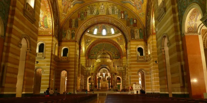 CathedralBasilicaofSt.Louis建於1907-1914年。大教堂無論外部還是內部都非常的莊嚴富麗。它的外部是羅馬式建築風格,花崗巖牆壁,玫瑰花窗,兩個厚重的石塔,該堂的主保聖人是法國國王路易9世。1997年若望保祿二世將其列為宗座聖殿。該堂以馬賽克裝飾著稱。拱形的圓頂被羅馬式的尖頂窗户託舉着。進入教堂的一剎那,彷彿穿越時空回到拜占庭時代。拱廊,牆壁,圓頂都貼滿金碧輝煌的馬賽克,總面積83000平方英尺,是二十位藝術家在整整七十五年的時間裏完成的。主聖壇和內部一個小教堂的馬賽克是Gorham公司完成的,而其中的意大利風格的馬賽克裝飾則是Tiffany公司負責的。
