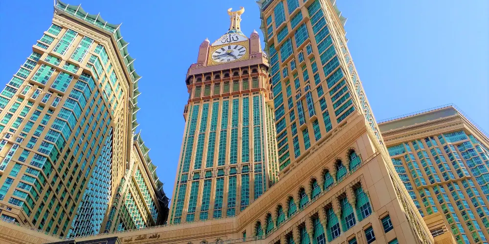 Abraj Al-Bait塔,又稱為麥加皇家鐘塔酒店,位於沙特阿拉伯麥加市。皇家鐘塔是這組建築的標誌性建築,頂部裝有世界上較大的鐘錶之一,直徑達43米。鐘塔的設計融合了現代建築技術和傳統伊斯蘭建築風格,氣勢恢宏。