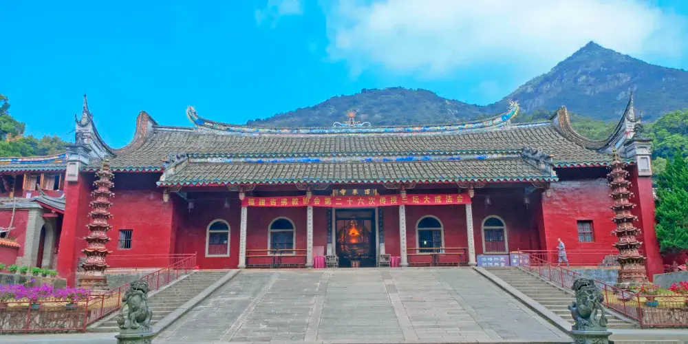 鼓山湧泉寺為“閩剎之冠”,又是全國重點寺廟之一。寺建在鼓山山腰,前為香爐峰,後倚白雲峰,有“進山不見寺,進寺不見山”的奇特建築格局。湧泉寺較為壯觀的要數大雄寶殿了,其他的大小殿宇都簇擁著大雄寶殿,殿內有釋迦摩尼的三世像。寺廟內部金碧輝煌、莊嚴肅穆,讓人不敢褻瀆佛的偉大。寺廟裡還有很多珍貴的藏書、經文,還有其他的一些裝飾用品和陶瓷品,值得一看。