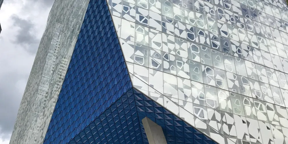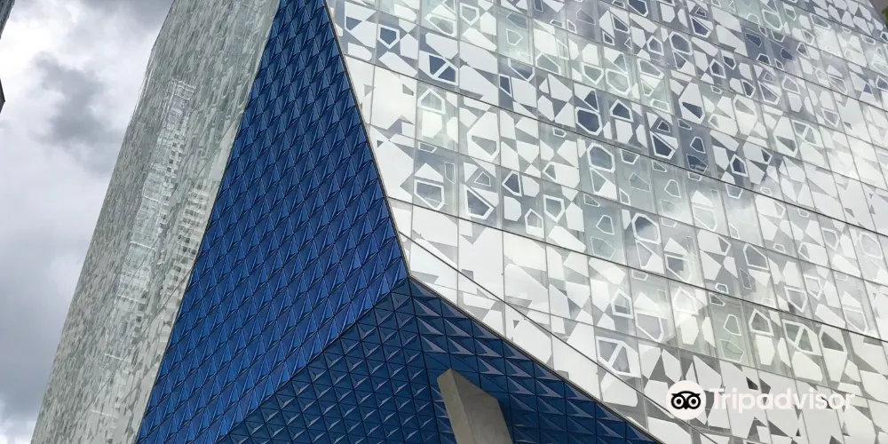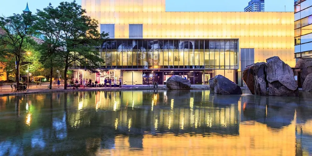 美術館門前有一座青銅雕塑作品,這是著名的英國雕塑家亨利·摩爾創作的。而在正門北側的水泥建築上多了一面炫目的玻璃牆和一個輕薄的玻璃翅膀,夜晚燈光的照射讓玻璃建築通體發光,成為夜幕下一道亮麗的風景線。