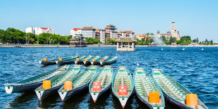 龍舟池位於廈門市集美區,是陳嘉庚在海灘上築堤圍墾,形成外、中、內三池,其中外池俗稱“龍舟池”。池畔建有式樣各不相同的七個亭子。如果恰逢遇到端午節,這裡會注滿水,舉辦龍舟賽,遊客還可以抓鴨子,是休閒度假的好去處。