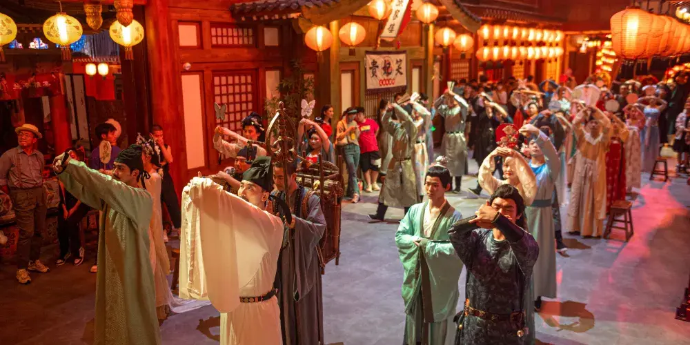 長安十二時辰主題街區是以唐市井文化為源點,以網劇《長安十二時辰》IP為主題,以沉浸式體驗為核心,在建築、軟裝、錢幣、人物、服裝、語言、音樂、故事等領域進行全唐化包裝,同時圍繞深度沉浸式故事體驗,設定配套的餐飲、文創、演藝等業態內容,整體打造集全唐空間遊玩、唐風市井體驗、主題沉浸互動、唐樂歌舞演藝、文化社交休閑等為一體的全唐市井文化體驗地。