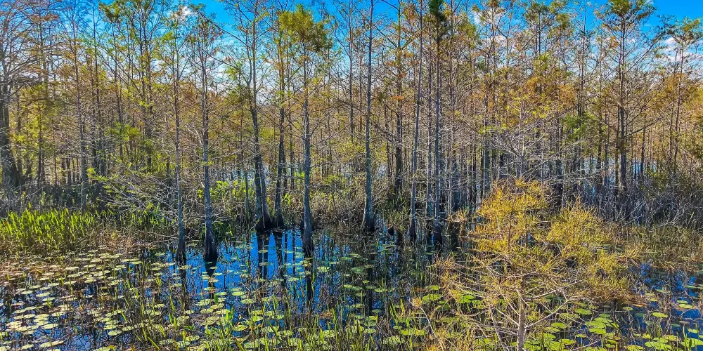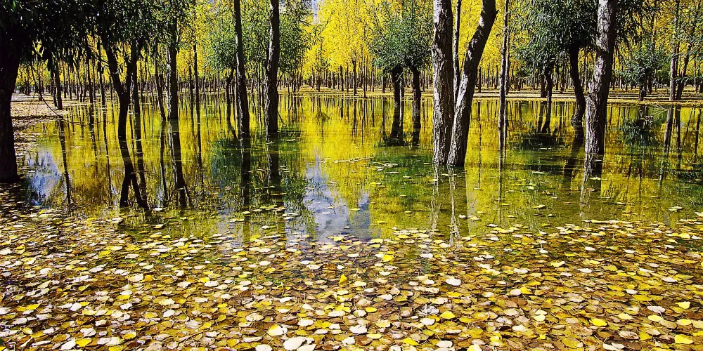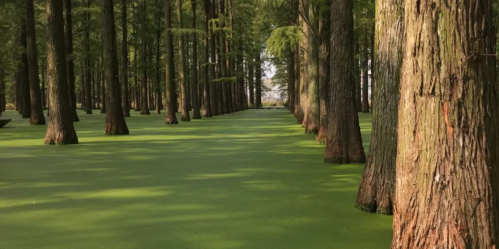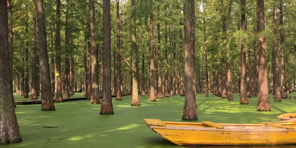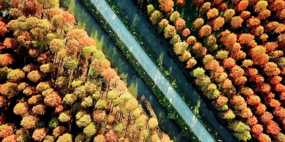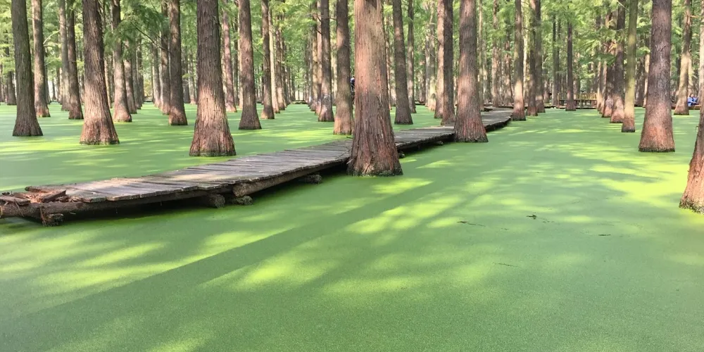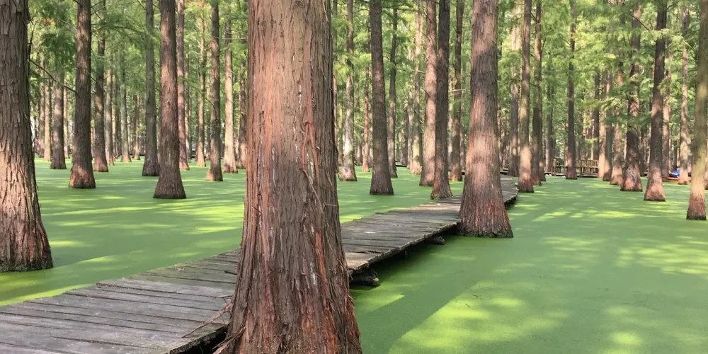 進入正門,整齊排列的水杉即跳入眼簾,一株株水杉筆直矗。到了春天,養魚戶在池塘裡放水養魚,遊客可以一邊劃著船,一邊欣賞濕地池杉林。