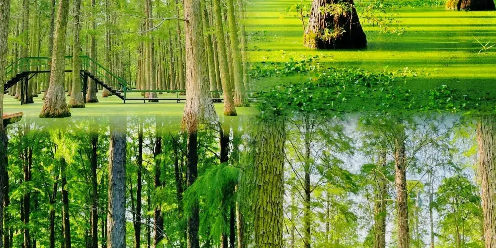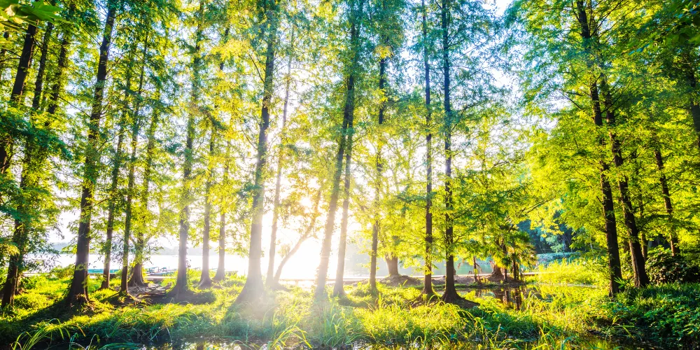 淥洋湖濕地公園內地勢平坦,林木蔥鬱,空氣清新,水鄉風情濃鬱,特別是以耐水濕樹種池杉、落羽杉、水杉等為主的森林景觀資源獨具特色。
