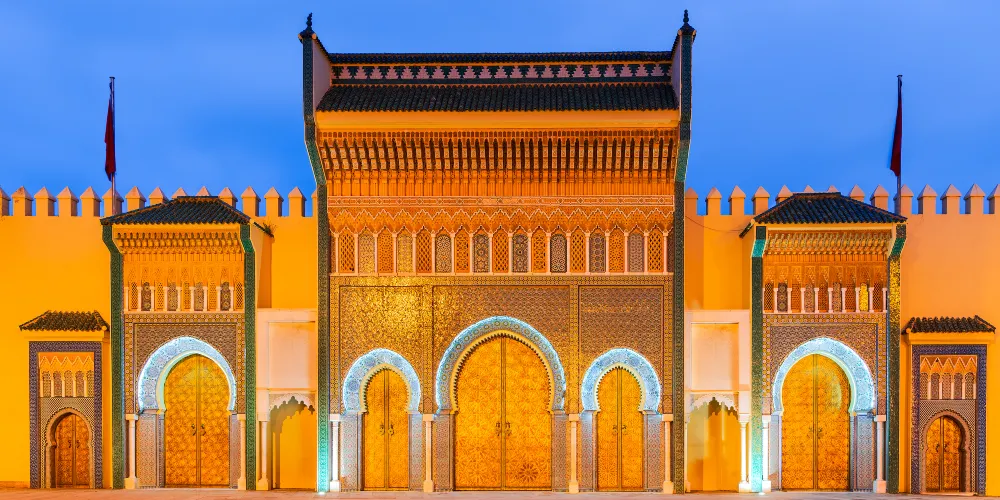 菲斯皇宮建於十三世紀,遊客雖然無法入內參觀,但是可以在1968年建造的阿拉維廣場上欣賞皇宮金燦燦的安達盧西亞風格大門。它的建築特點是對稱性,鍍金的青銅門,精緻的馬賽克,白色的大理石柱,設計師用高貴的材料與鮮艷的色彩勾勒出皇宮的富麗堂皇,隨便一拍都是大片的感覺。