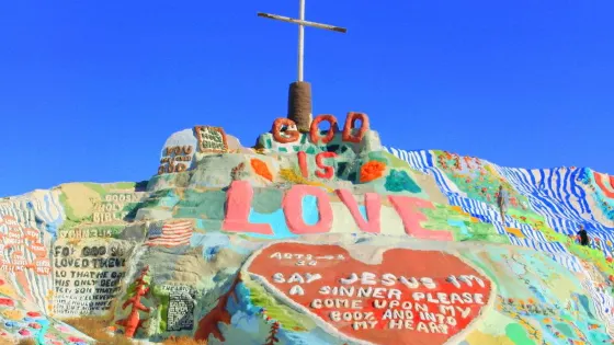 救贖山坐落在科羅拉多沙漠,山上樹立這“God is Love”的標註,很難想象這居然是出自一位80歲的老爺爺-Leonard Knight之手。這位老爺爺在80年代中期開始為山油漆,持續24年之久,終於建成了這座獨一無二的山。