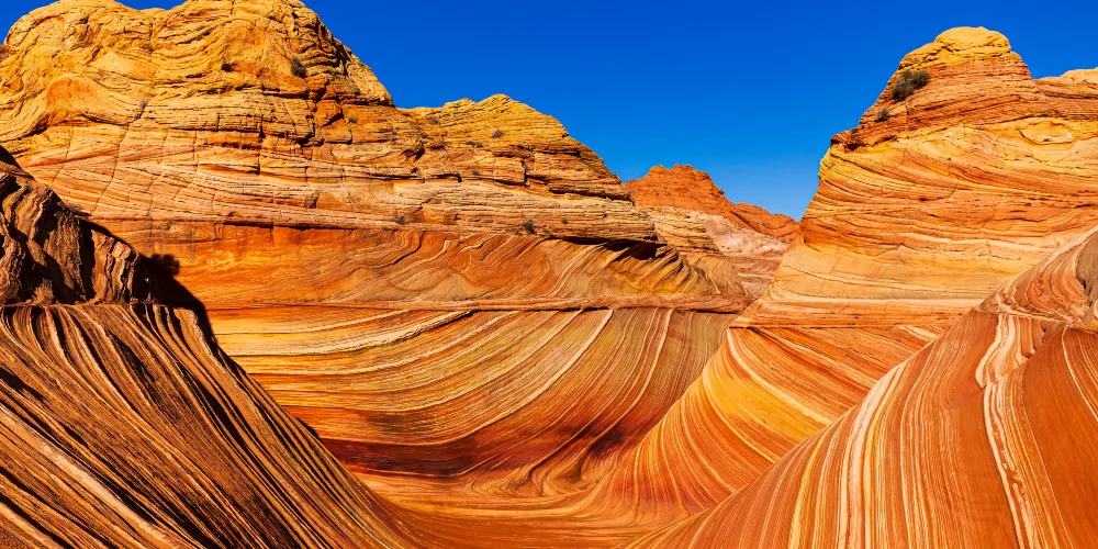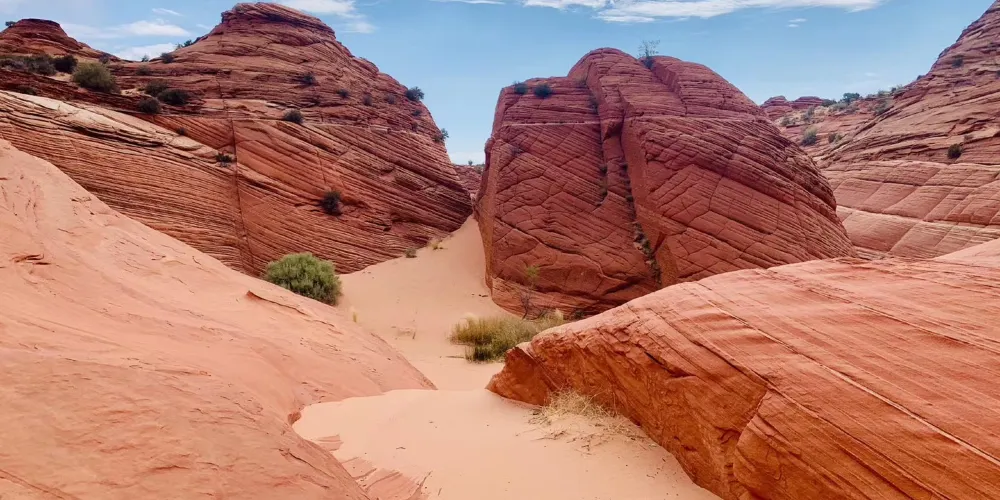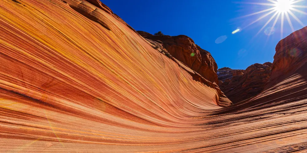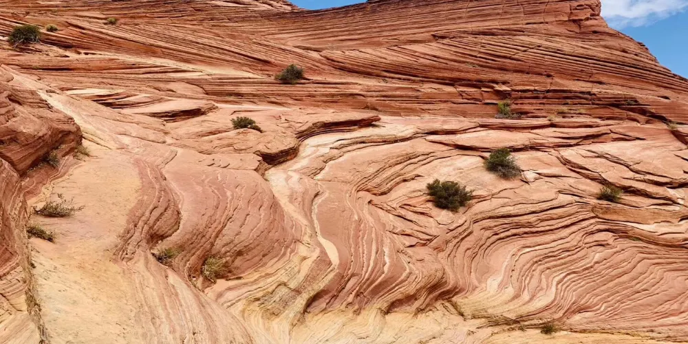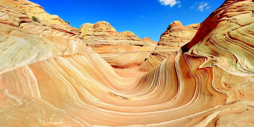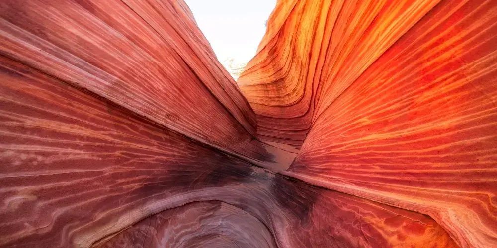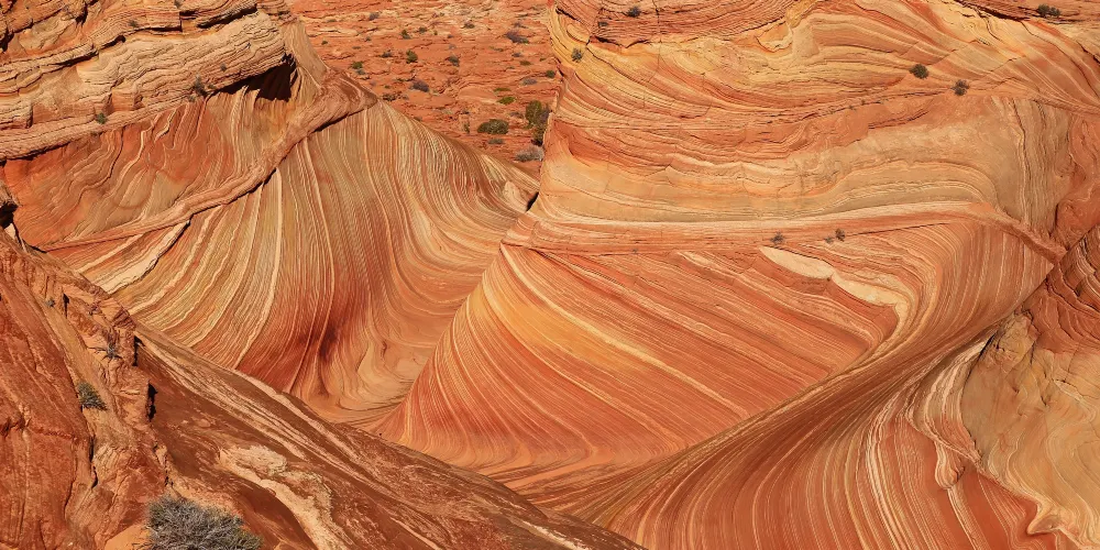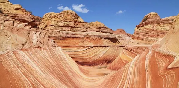 波浪谷地處美國猶他州南部與亞利桑那州接壤的帕瑞亞河畔,是一片有層疊狀紋路的岩沙峽谷。谷中岩石的層面是由侏羅紀時期就開始沉積的巨大沙丘組成,沙丘不斷被一層層浸漬了地下水的紅沙所覆蓋,天長日久,水中的礦物質把沙轉變成了砂岩。而隨著科羅拉多平原的上升,峽谷中形成了一種令人炫目的三維效果紋路。