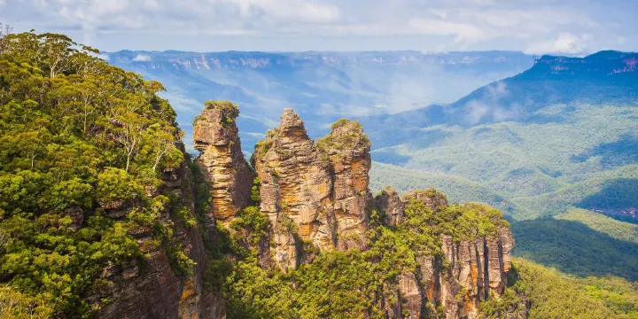 雪梨藍山三姐妹峰是藍山最知名、最受歡迎的旅遊景點之一,是它的標誌。坐落於新南威爾士州的大藍山山脈地區,臨近卡通巴鎮,是由三個依在一起的黃褐色的崖頭組成的一片奇景,但因為山勢險峻,只能遠觀。