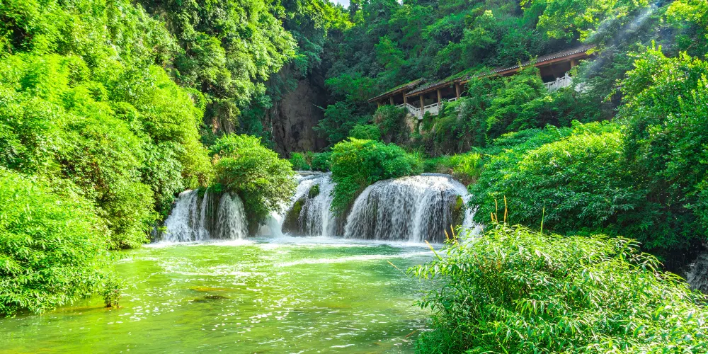 天河潭位於貴陽西南城郊,在這裡可以看到喀斯特溶洞和鈣化灘瀑布群,是典型的貴州山水風貌。景區內有多個鈣化灘瀑布,其中210米的瀑布,這個寬度在國內十分罕見。這裡的溶洞分為水洞和旱洞,水洞需要坐船遊覽。在狹長的地下河中坐著小船,看石筍、石鐘乳等景象,別有一番風情。山上刺激的高空溜索和少數民族村寨也值得推薦。