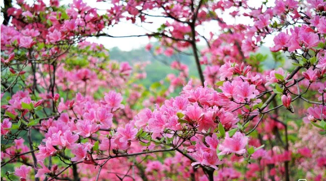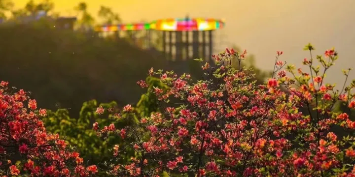 天馬寨位於湖北英山境內,古為蘄黃四十八寨之一,四月是天馬寨美麗的季節,五彩杜鵑沿著高海拔接近1100米的高度梯次盛開。尤其是進入下旬,盛開的杜鵑開遍整個山脈的大小山脊,讓蕩漾翠綠的群山披上綿延十里的「五彩絲帶」,蔚為壯觀。也讓這座默默無名的大山一時間人滿為患。天馬寨與其他景區的杜鵑群落不同,杜鵑花海雖然還是以紅色為主打,但是紫色杜鵑的稀有綻放,更具特色。走進花海中,不得不被這裡杜鵑的魅力所震撼,杜鵑恣意盛開,有的依附於雜亂的怪石之間,有的紅紫相間,有的與一些燦爛的野花作伴,它們扎堆成片,頑強的枝幹或疏斜,或叢生,棵與棵相互扶持,枝與枝彼此並肩,朵與朵挨著笑臉,綻放著各自的燦爛,連在一起,宛若仙境,獨樹一幟,美艷稱絕。人在花間走,如在花海遊。淡淡的花香滌蕩著心神,讓人如痴如醉。從山腰一直開到山頂,深紅、粉紅、深紫、灰紫、鵝黃,淡白,色彩斑斕,璀燦成趣,爛漫整座大山。像一幅神妙的山水畫卷令人眼花繚亂,又似一匹匹狀如簇擁奔騰的駿馬,身披五彩朝霞奔騰簇擁心靈的溫暖。綿延不絕的花朵將遊人的腳步向上拉扯,美在自然。