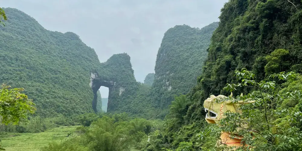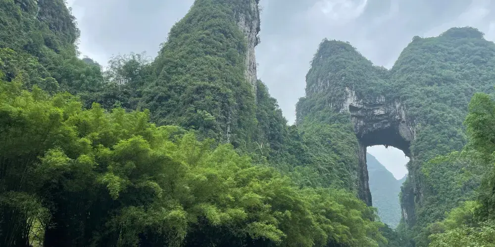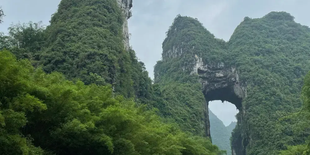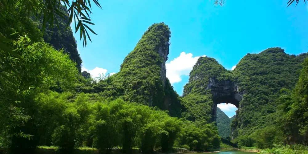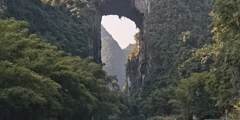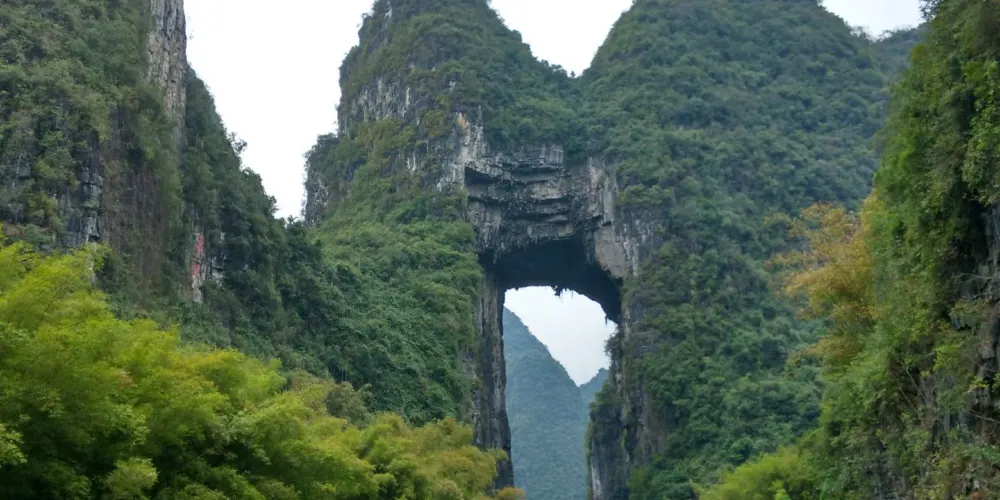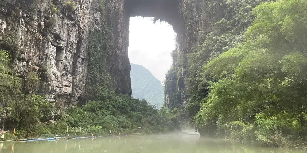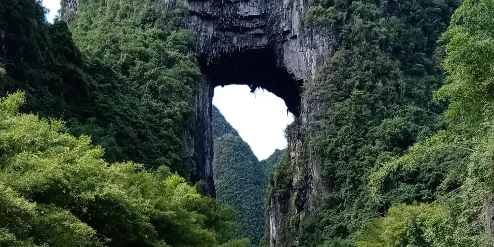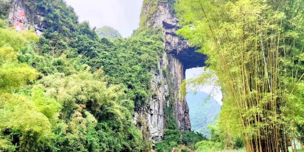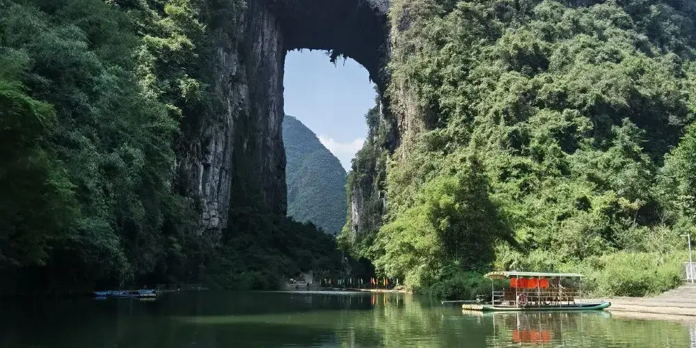 天門山位於廣西壯族自治區河池市羅城仫佬族自治縣懷群鎮。這裡有一處巨大的岩石,其形狀猶如一座拉開帷幕的舞台,又像一扇敞開的大門,氣勢宏偉,巧奪天工。岩下的元蒙河從中緩緩流淌,清澈見底,吸引著無數遊客前來觀光。