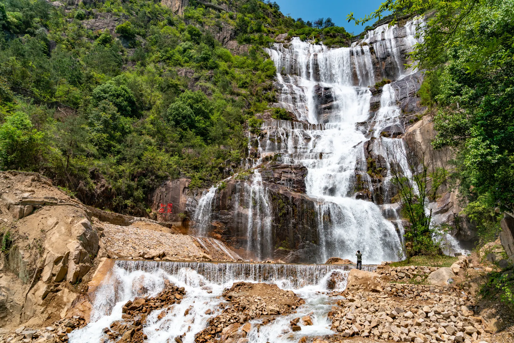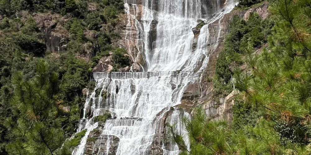 天台山大瀑布位於台州市天台縣,距天台城區只有6公里,歷史上被稱桐柏瀑布,又稱三井瀑布。主體大瀑布總落差 325 米,最大寬度90米,是個罕見的高落差親水梯級瀑布群,堪稱中華第一高瀑。景區內包括大瀑布區塊、九龍湖區塊、桐柏宮區塊、瓊台仙谷區塊,通過觀景電梯、索橋、玻璃吊橋、金庭湖環湖綠道等串點成片,是一個融峽谷景觀、瀑布景觀、懸空棧道、時尚體驗、仙道文化於一體的大型山岳型景區。遊客可以從幾十里外就能看到瀑布噴泄而下的壯麗畫卷,也可以近距離感受大瀑布,親水嬉水。