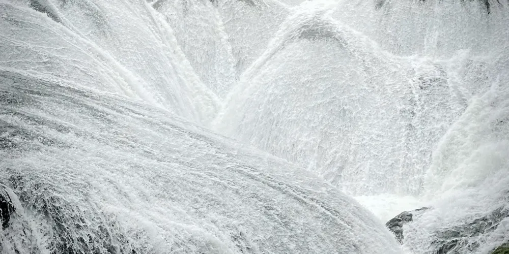 這個瀑布只有十餘米高,上面成漏鬥形,底部是槽狀溶潭。在潭沿面上隆起的石包,象一張張下覆的蓮葉,交錯搭連,河水在每一張葉面上均勻鋪開,縱情漫流,象千千萬萬條大大小小的銀鏈,輕音嚷嚷地緩緩墜入溶潭,永遠沒完沒了。三岔河水被鈣華灘分成串串珠鏈,墜入深潭,是黃果樹瀑布群中最秀美的瀑布。