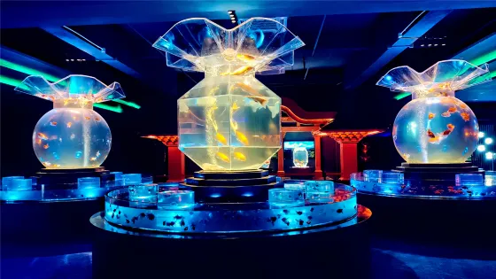 盎然生趣、金鱗悠然,紅、橙、紫、藍、墨、銀白、五花等各種色彩絢麗的金魚暢游在流光溢彩的金魚家園裡。金魚的家園造型別緻,各式各樣的家園在各種緯度的空間中合理構建,就如同絢麗虛幻的萬花筒般綻放出各種美麗的畫面。國粹金魚、傳統文化與現代藝術在這裡結合,配合七彩迷離的燈光效果以及沁人心脾的優雅音樂,為您帶來與眾不同的身心舒緩體驗。