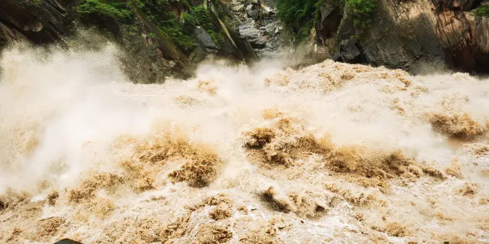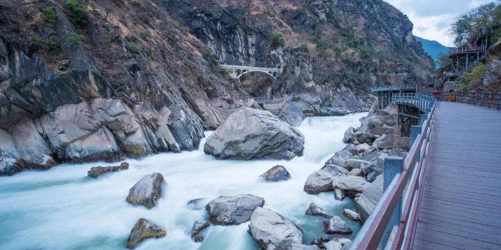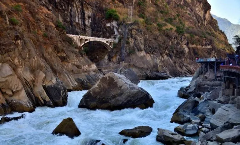 則評價虎跳峽是世界上知名的大峽穀,以奇險雄壯著稱於世。全長16公裡,分上虎跳、中虎跳、下虎跳三段,從虎跳峽鎮過沖江河洞哈巴雪山山麓順江而下,即可進入峽穀。中虎跳離上虎跳5公裡,江面落差甚大,“滿天星”礁石區是這裡很險的地方。百米峽穀中,礁石林立,水流湍急,驚濤拍岸。中虎跳重要的景觀石是“滿天星”和“一線天”。