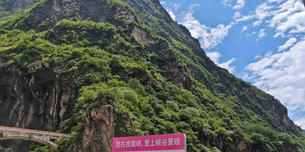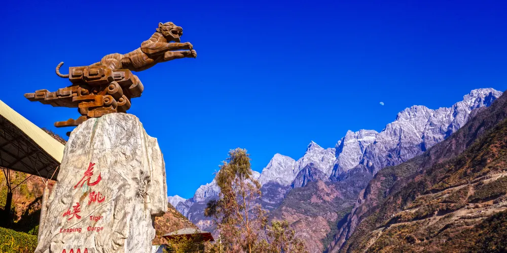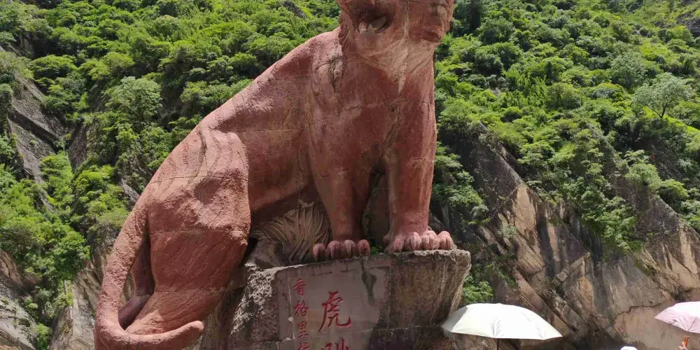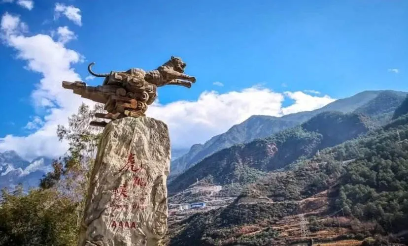 則評價虎跳峽峽口海拔1800米;南岸的玉龍雪山海拔5596米,臨峽一側山體陡峭,幾乎是絕壁,無路可尋;北岸的哈巴雪山海拔5386米,臨峽一側山坡稍緩,這一側有一條簡易的碎石公路,貫通全峽,公路上方還有一條步行小路。上虎跳是峽谷中窄的一段,離公路邊的虎跳峽鎮9公里,其江心雄踞一塊巨石,橫卧中流,如一道跌瀑高坎陡立眼前,把激流一分為二,驚濤震天。傳説曾有一猛虎借江心這塊巨石,從玉龍雪山一側,一躍而跳到哈巴雪山,故此石取名虎跳石。