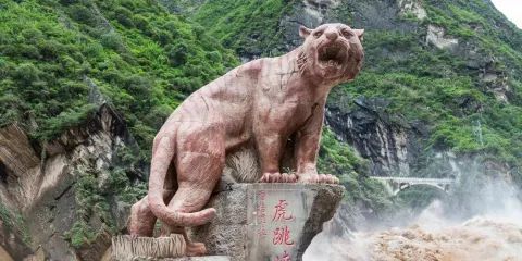 虎跳峽是世界上知名的大峽穀,以奇險雄壯著稱於世。全長16公裡,分上虎跳、中虎跳、下虎跳三段,從虎跳峽鎮過沖江河洞哈巴雪山山麓順江而下,即可進入峽穀。中虎跳離上虎跳5公裡,江面落差甚大,“滿天星”礁石區是這裡很險的地方。百米峽穀中,礁石林立,水流湍急,驚濤拍岸。中虎跳重要的景觀石是“滿天星”和“一線天”。