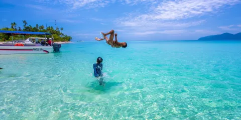 位於馬來西亞沙巴的廷巴廷巴島,是一顆真正的海上明珠,以其原始的自然美景和充滿活力的海洋生態系統吸引著來自世界各地的遊客和潛水愛好者。該島以其潔白細膩的沙灘和清澈見底的海水而聞名。退潮時,島嶼會浮現出一片獨特的沙洲,宛如一條閃耀的新娘面紗延伸至海面。廷巴廷巴島周圍水域海洋生物種類繁多,珊瑚礁壯麗壯觀,是適合各個潛水水平的絕佳潛水勝地。潛水員可以邂逅色彩斑斕的熱帶魚、優雅的海龜,偶爾還能邂逅鯊魚或鰩魚,這裡是體驗海底世界奇觀的理想地點。