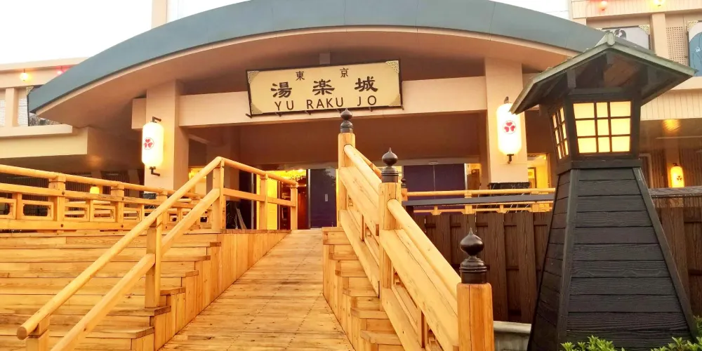 東京湯樂城位於千葉縣富里市七榮650-35,佔地面積近20000平米,可同時容納近2000人娛樂入浴,是一座帶有現代歐式風格同時傳承江户時代古民宅氣息的綜合性娛樂温浴設施。東京湯樂城初的設計理念是讓遊客在一座城內既能感受到古老、耐人尋味的日本文化、美食、湯主題,又能結合各種現代的科技元素。這裡有長達150米的大型音樂噴泉,光影的LED天幕顯示屏,完整地展示現代與古老結合的城文化。這裡有長20餘米的木質結構的階梯式拱橋與古色古香的大門,給人震撼的視覺效果。在木橋下流淌着人工泉水,這裏也是湯樂城每天六場"水舞秀"表演的地方。