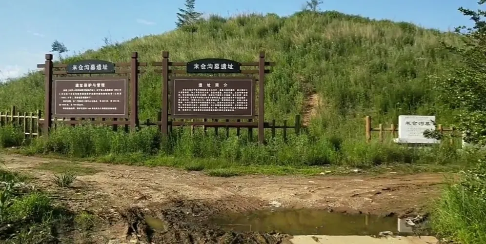 將軍墓位於桓仁雅河鄉米倉溝村北約500米的山崗上,距今已有1500多年的歷史。將軍墓是一座大型的封土石室墓,原呈截尖方錐形,像一衹覆扣的鬥,天長日久,雨沖水涮,楞角圓鈍了,形狀漸漸近似了圓丘。墓穴由甬道、耳室、墓室構成。甬道兩側分別築有南耳室和北耳室,甬道東端是墓門,上有門楣、下有門檻,兩扇石雕的門扉,早已倒地,進門後便是寬敞的墓室。墓室平面呈方形,藻井為四層平形疊澀以上覆鬥狀。地面平平整整的鋪着巨石。南北平例兩具石棺床,是整塊花崗巖。墓室四壁、平行疊澀樑、藻井及耳室內全部繪有壁畫。壁畫繪在墓壁一層薄薄的白灰面上。墓室四壁繪有蓮花圖案,每朵蓮花都為側視,為9個花瓣,有5瓣用紅色線條勾勒而成,另4瓣用墨線在每兩瓣花中間又畫出尖狀的花瓣,黑紅相間,錯落有至。每朵蓮花下部用墨線勾勒出“工”字形花託,形成完整的個體。東壁有蓮花5行,每行11朵,共55朵。南北兩壁各為5行,每行12朵,共繪60朵。西壁為甬道中分,也繪有幾朵蓮花。米倉溝將軍墓對於研究高句麗墓制葬俗、繪畫藝術、佛教信仰以及高句麗壁畫墓的編年,都具有重要的價值。