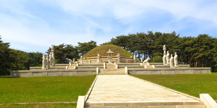 原稱顯陵,高麗時代興建,安葬高麗太祖王建。改建於1994年。它建築在黃海北道開豐郡海山裡的松岳山支脈萬壽山的小山崗上,從開城工業地區的市中心往西北走約3.5公里就能到達。王陵旁立着刻了已故朝鮮前領袖:金日成親筆的高麗太祖王建王陵改建碑。王陵建築陵園門內有祭堂和兩個碑閣。祭堂裏有王建畫像和有關王建生前活動的畫,碑閣裏有記載了王陵沿革的陵碑和記載了建立和維修情況的陵碑。王陵是典型的高句麗式石室土墓,周遭立了刻有子、醜、寅等12地支神的12角石屏風,其外邊圍有石欄桿。墳頭高8米、石屏風對角長19米、王陵四角有石虎,前面有祭壇、望柱石、石燈等。王陵下面分兩排立着8位對國家統一有功的臣子石像,每排4人,一排為文官,高3.6米;另一排為武官高3.7米。墓室內部有放遺物的長台,牆上有竹、松等的壁畫。壁畫很好地表現了朝鮮畫的構圖、線條、色彩遒勁、纖細、生動的畫法。在王陵及其周邊出土的文物有:玉石帶鈎、菊花紋鑲嵌青瓷、青銅壺、金銅座像、金銅裝飾品等多種遺物。據朝鮮古籍記載,王建的腰帶上有玉帶鈎達62個。出土文物中具有代表性的是金銅座像。金銅座像戴的王冠,由外冠和內冠組成。外冠下面有2.5釐米寬的帶子,帶子上有4條線。正面中心畫有山,其左右兩邊畫有雲紋,再其兩邊分別畫有兩個小犄角。內冠則高於外冠,垂著像瀑布傾瀉似的許多繐子。冠的周緣有規則地排列著8個圓形裝飾,現存的衹有6個。這一圓形裝飾裏面畫有太陽和月亮。在外冠和“內冠”的太陽、月亮、水等,是當時象徵國王的裝飾品。從金銅座像的面容看,好像是剛過40歲模樣,很好地刻畫了高麗國的創建者王建的風貌。這個金銅座像是刻畫了實在的人物王建的金屬工藝品,是珍貴的歷史文物。
