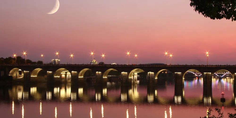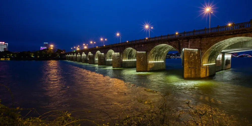 通濟橋橫跨在婺江上,婺江將金華分成南北兩區。橋上設置了形如花樹的路燈,中間為行車道,兩旁為行人路。如今白晝,通濟橋上汽車成隊平治,行人接踵如流;入夜,燈光橋影,江水搖曳,分外妖嬈。