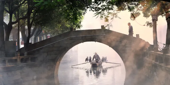 三橋是同里非常有名的三座石橋,指的是太平橋、吉利橋和長慶橋。自古以來同里就有“走三橋”習俗,每逢婚嫁喜慶時,當地人就會結隊走三橋,以討喜氣。三橋呈“品”字型,跨於三河交匯處,自然形成環行街道,沿岸鋪滿青石,兩岸築有花石欄,景色倒映在水中,橋上不時有行人通過,橋下行駛來往的船隻,成為古鎮一道獨特的風景。