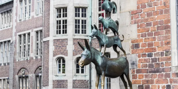 在不來梅市政廳的左側,擺放着一座2米高的銅製雕塑。有名的童話故事《不來梅的音樂家》的四位主人公們被以較吸引人的姿態雕塑出來。他們從上至下分別是主公雞、貓、狗和驢。整座城市中所處都可見到這四個小夥伴的身影,五月至十月的週日它們還會披上彩色的新裝,在大教堂廣場現場為人們講述自己的故事。
